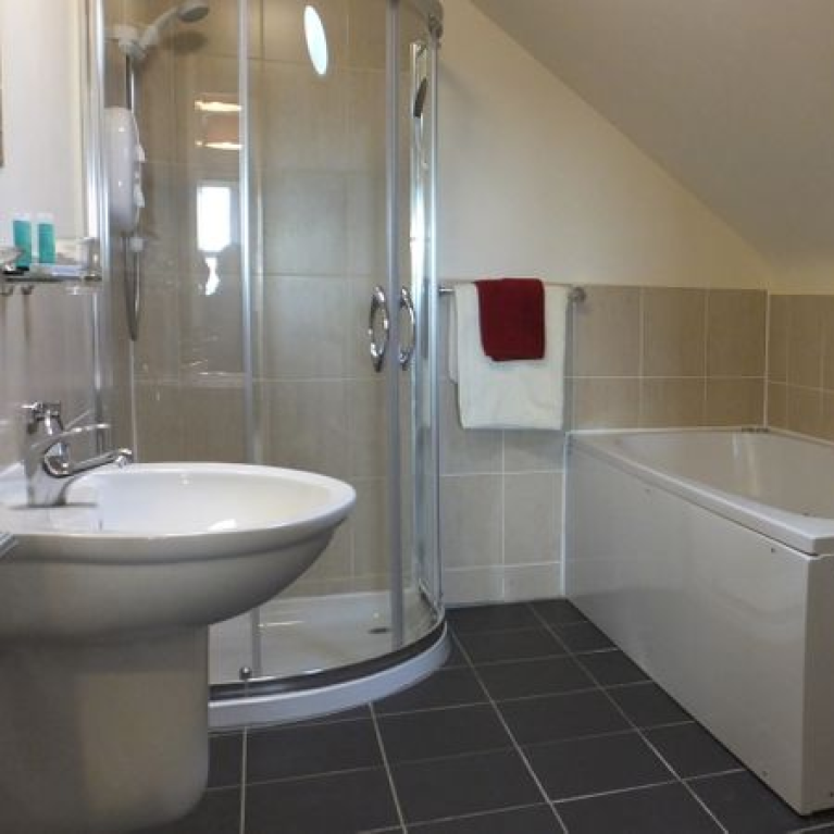 The Master bedroom upstairs will offer you a restful night’s sleep, with its super-king size double bed. The bedroom also benefits from having a wall mounted TV and all bed linen and towels are provided too. Directly off this bedroom are ensuite facilities including, large whirlpool bath, separate shower, wash basin, and toilet. On the ground floor there is a twin bedroom with ensuite shower room and WC.
