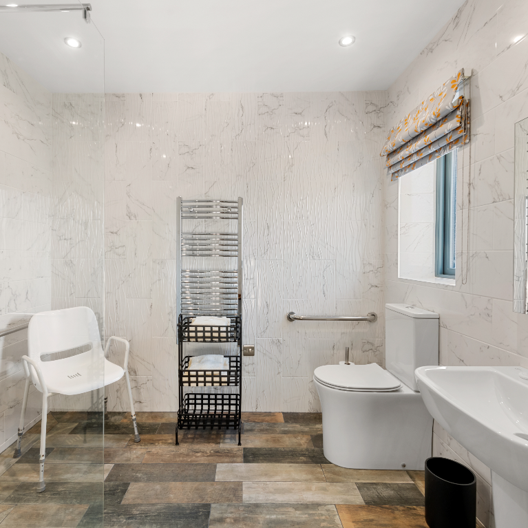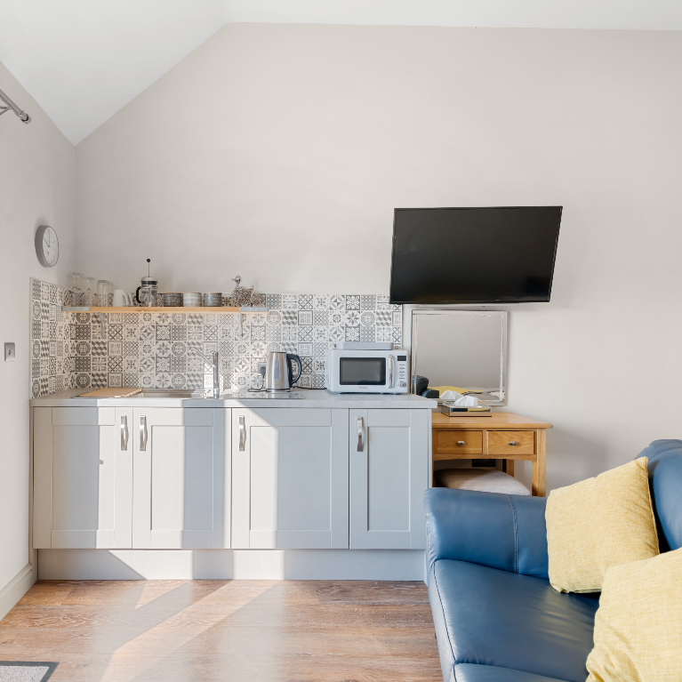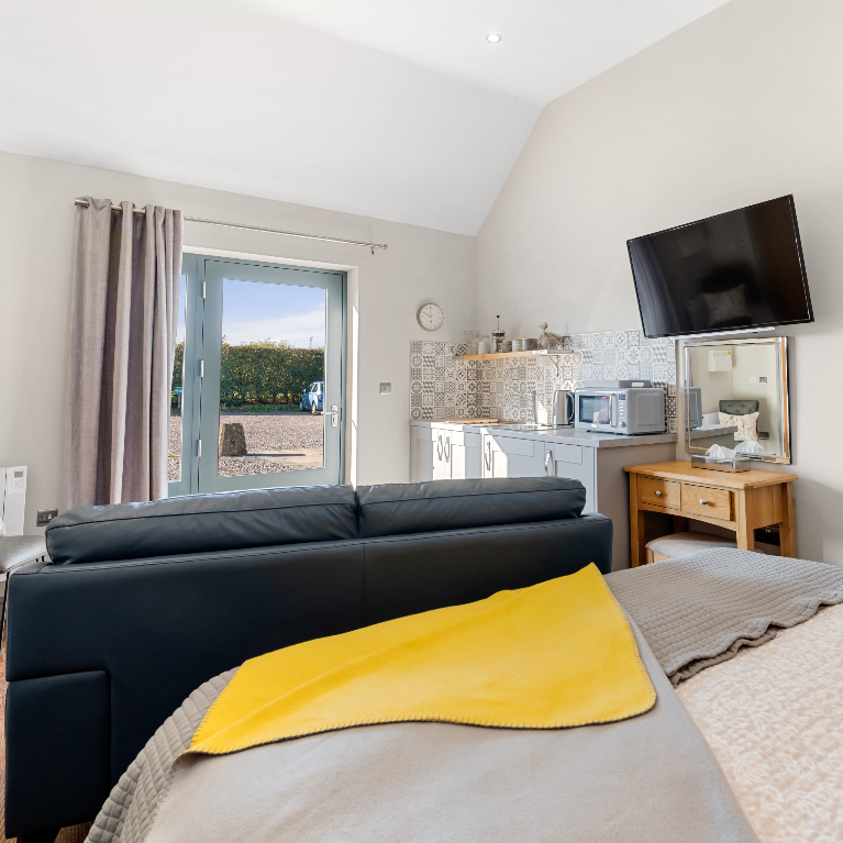 This comfortable king-size bedroom offers a step-free en-suite shower room and is thoughtfully equipped with tea and coffee making facilities, a microwave, toaster, fridge, and a small kitchen sink—ideal for light meals and relaxed, independent stays.